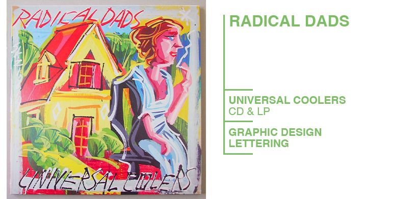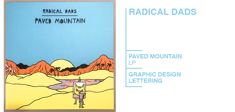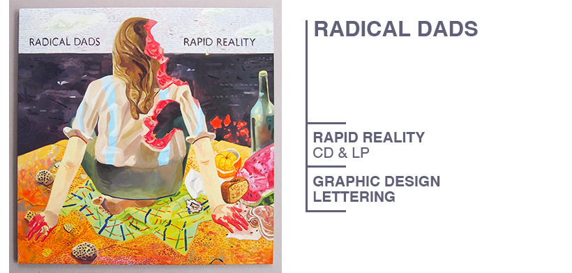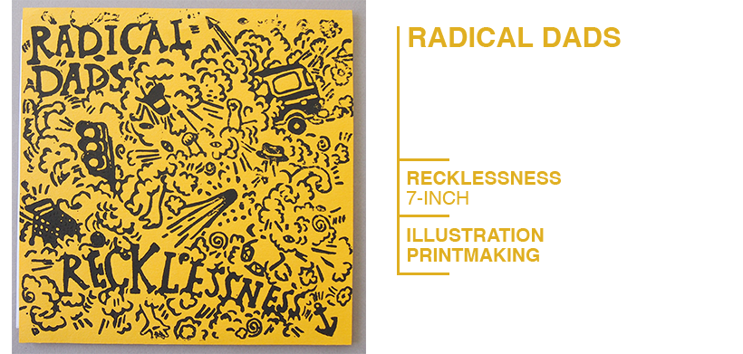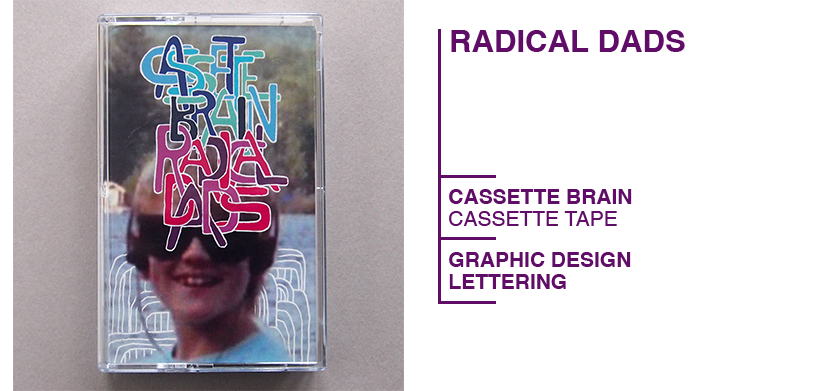 Radical Dads is an indie rock band from Brooklyn, NY, of which I am a member. For all of our albums we find artists we love to collaborate with and I take their artwork and prepare it for printing, which ranges from designing the layouts to touching up the artwork to adding song titles and other information. For some of our EPs and 7inches, such as Cassette Brain and Recklessness, I have created all the artwork myself. I have also built and designed the website, including building a custom Radical Dads font.